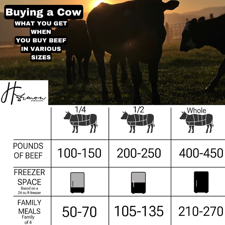 When you are buying beef, whether it is a Whole, Half, or Quarter, there are a lot of questions. The biggest being, how much freezer space do I need? Approximately how many pounds of meat should I expect? And how many meals for my family will this give me? To help new buyers, we have created this page to give some insight.